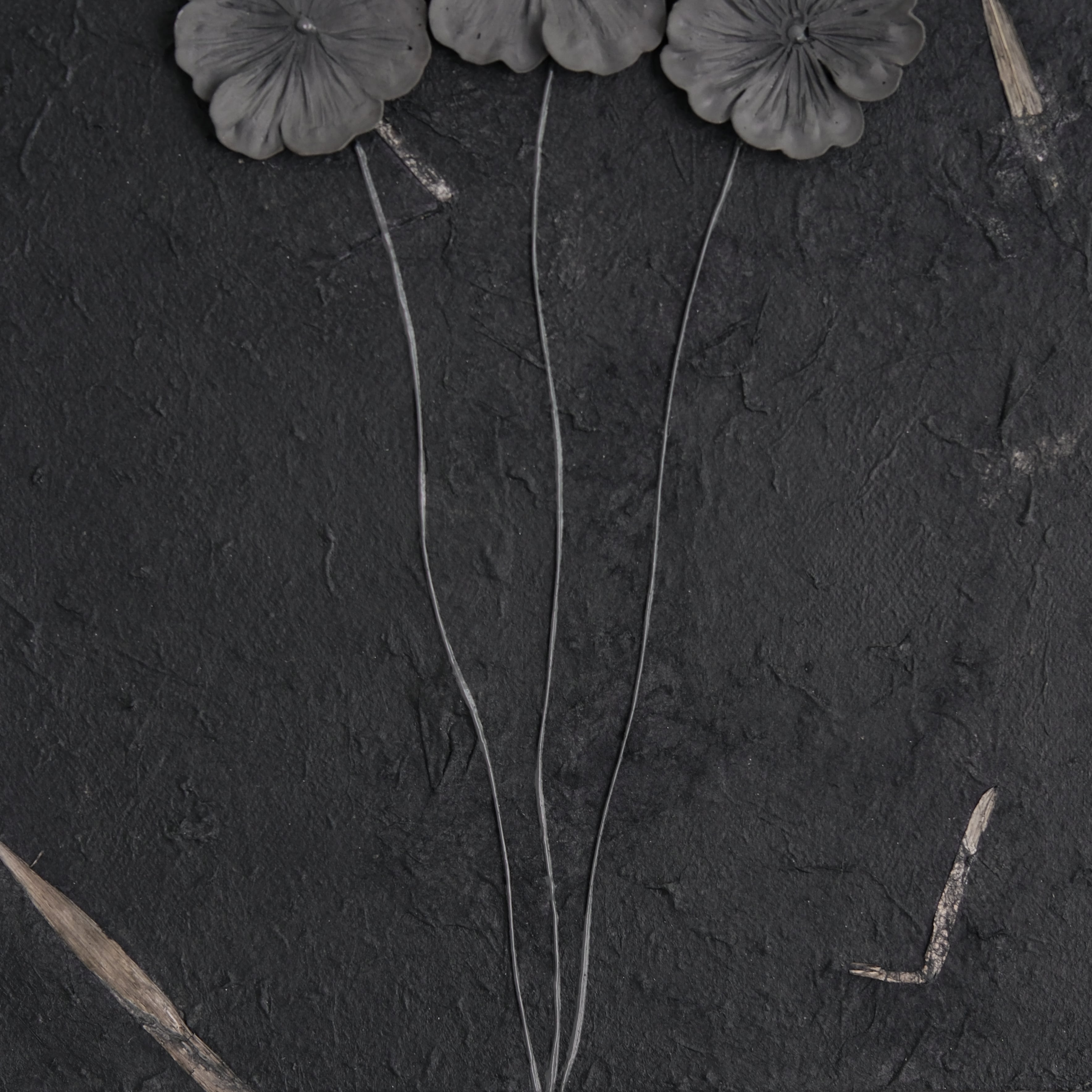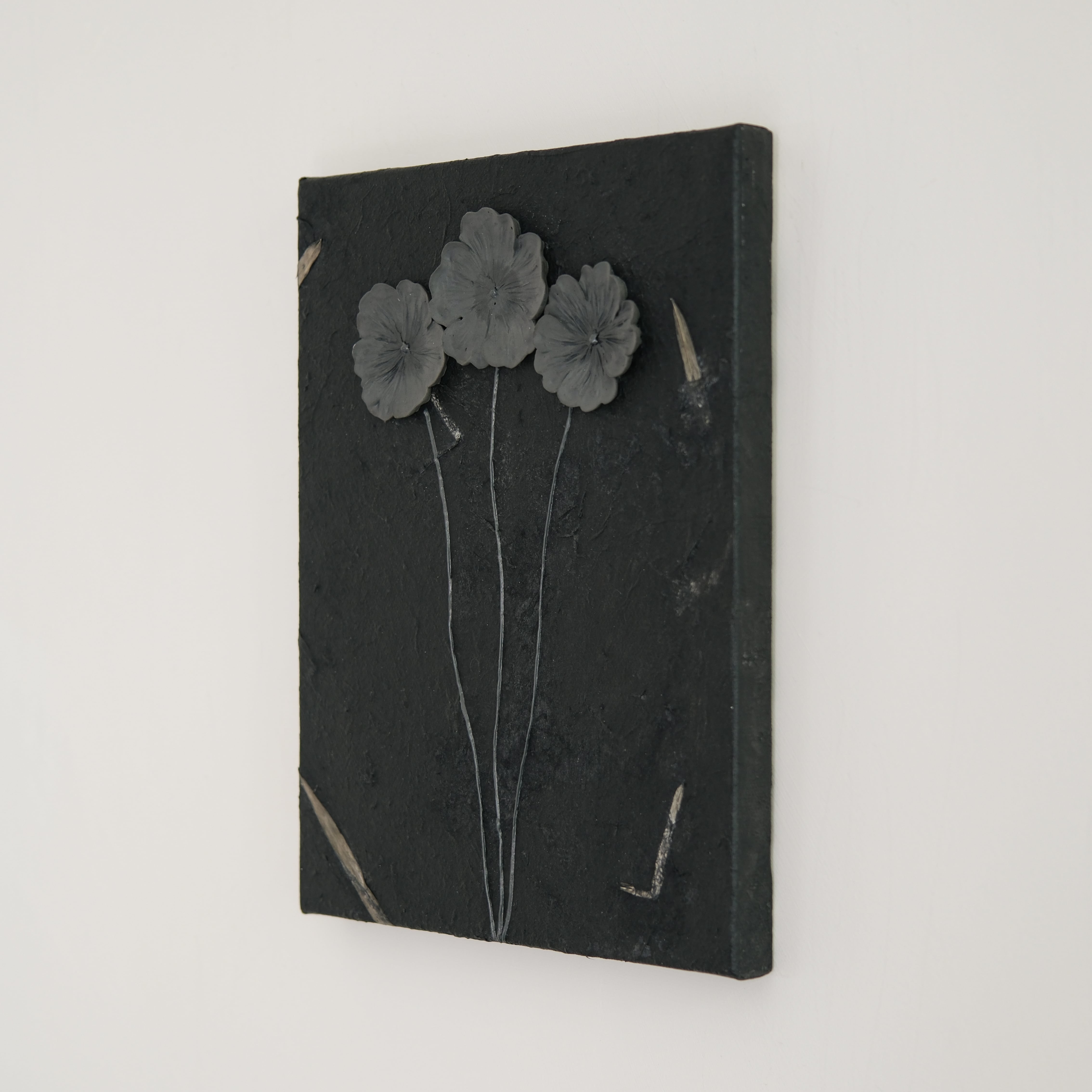 花びらにはわずかなダークグレーの揺らぎを含ませ、茎や背景にも微妙な濃淡を施しました。