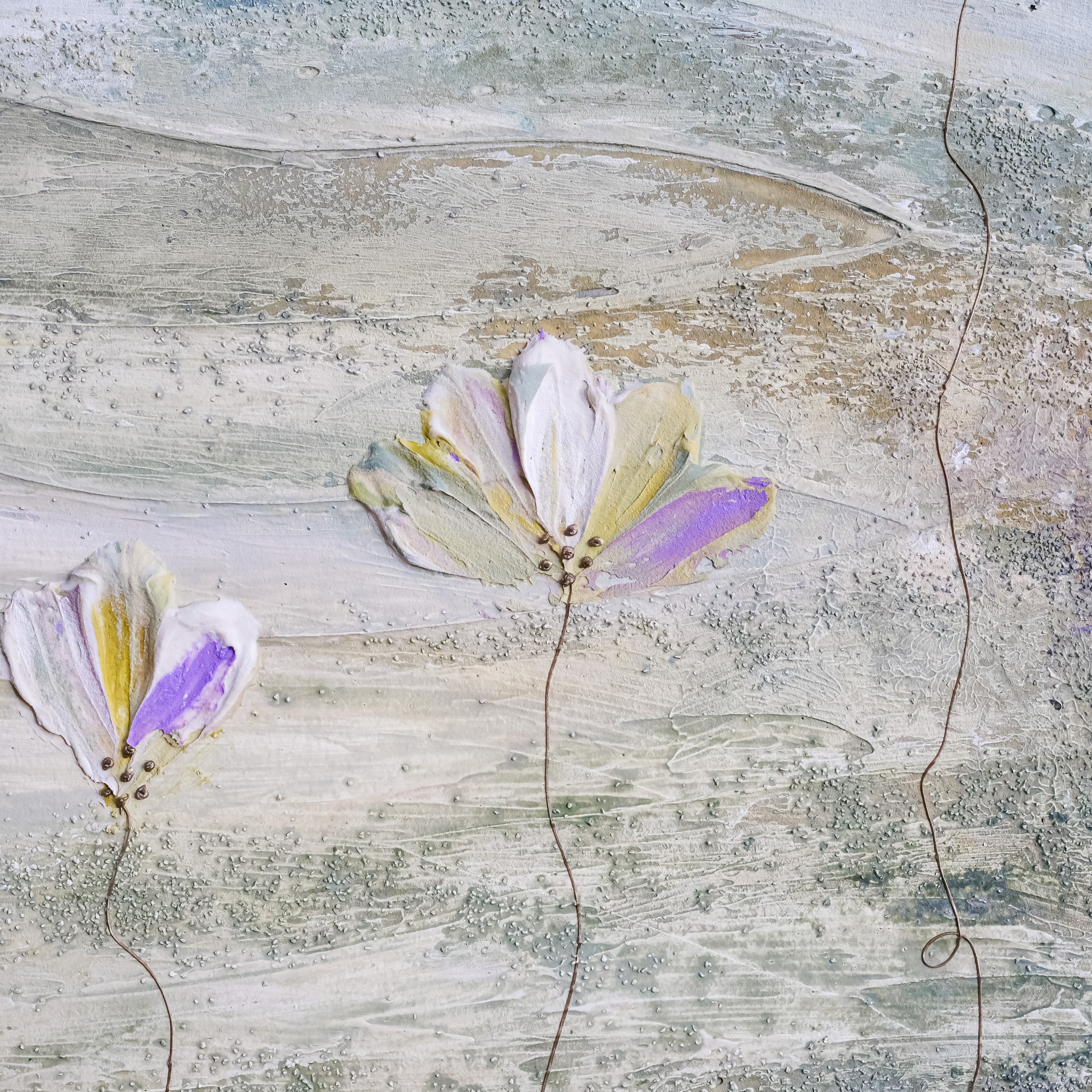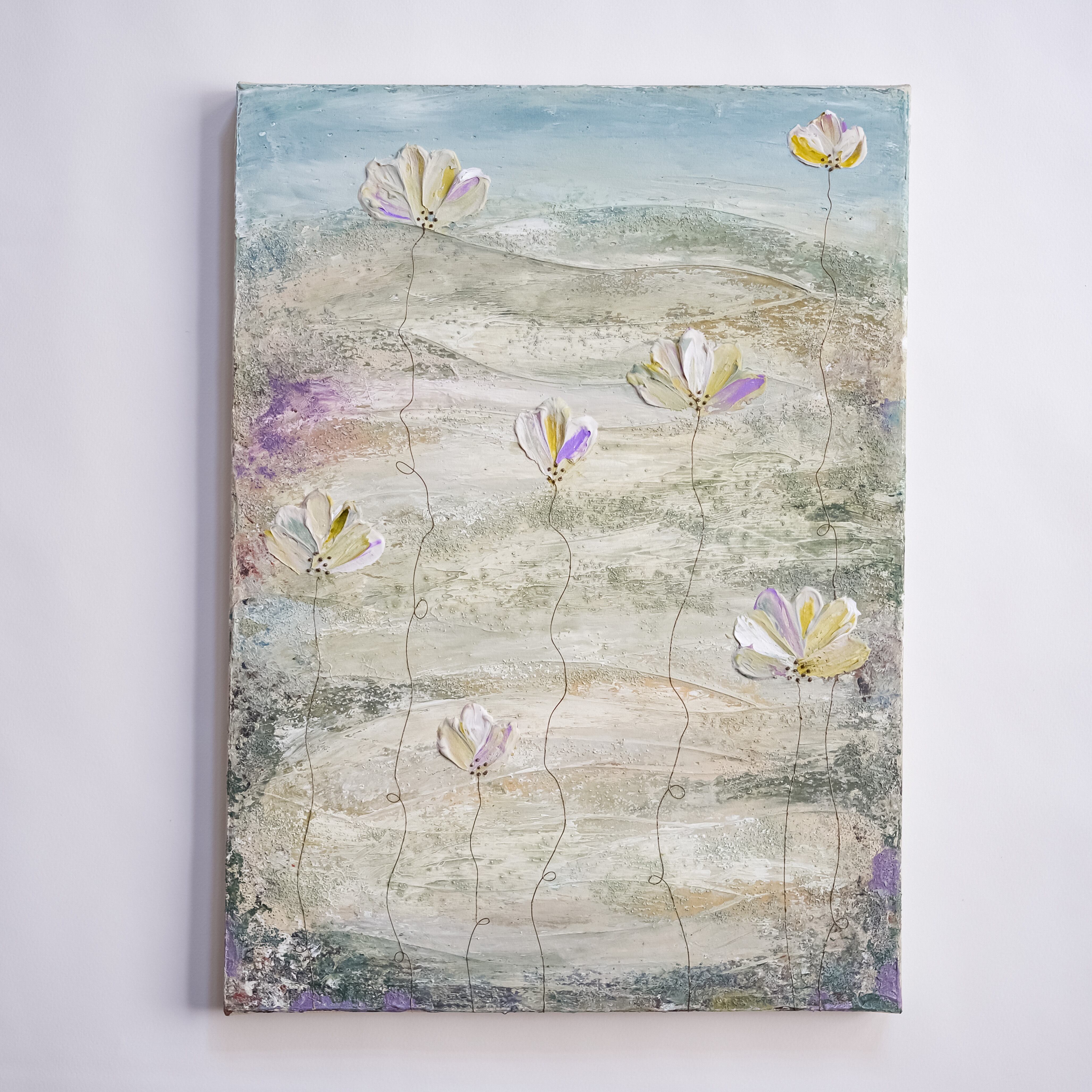 The artwork expresses that both the view from the high mountains and the flowers blooming at our feet are beautiful.