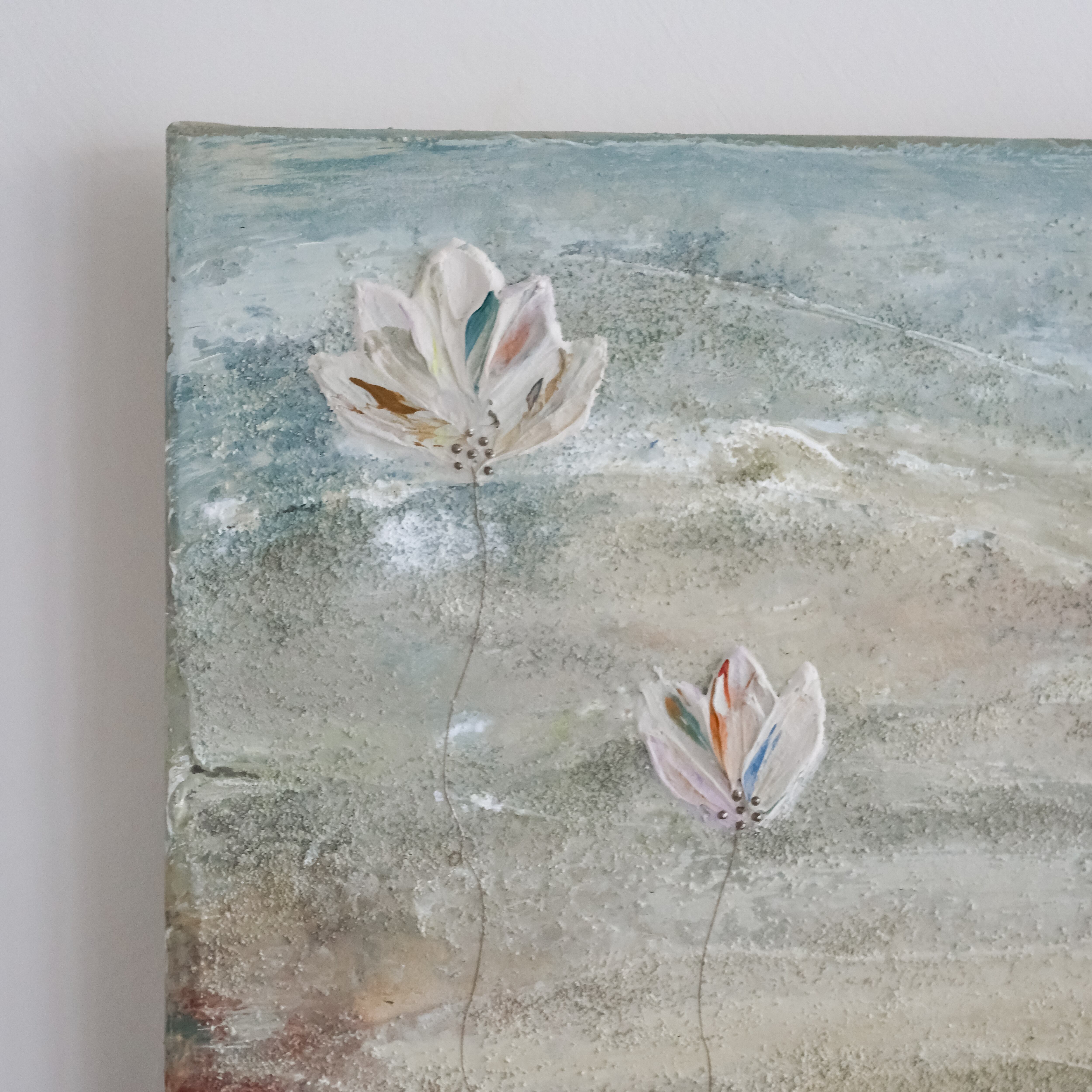 I painted mountains and a sea of clouds in the background of blooming flowers.