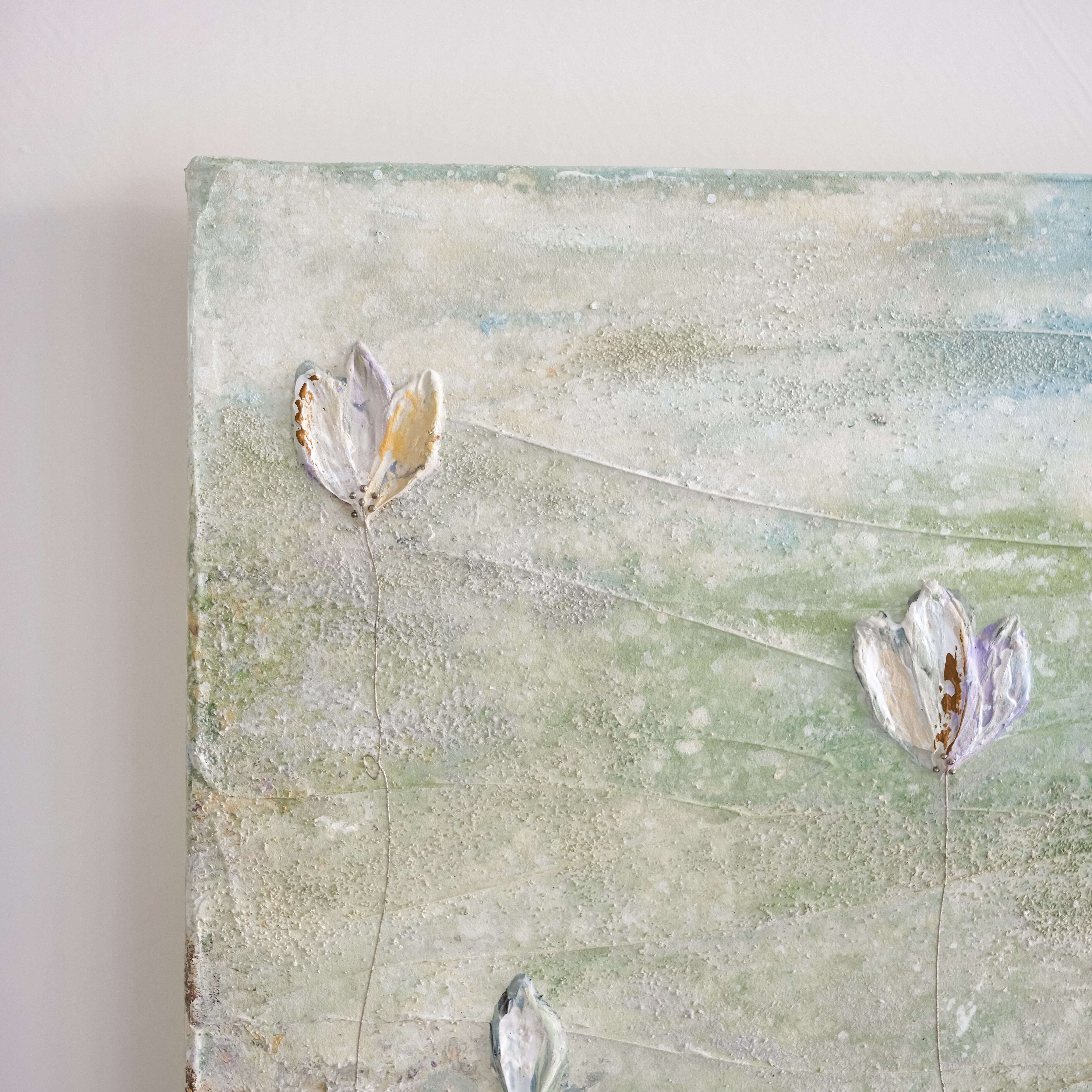 I painted mountains and a sea of clouds in the background of blooming flowers.